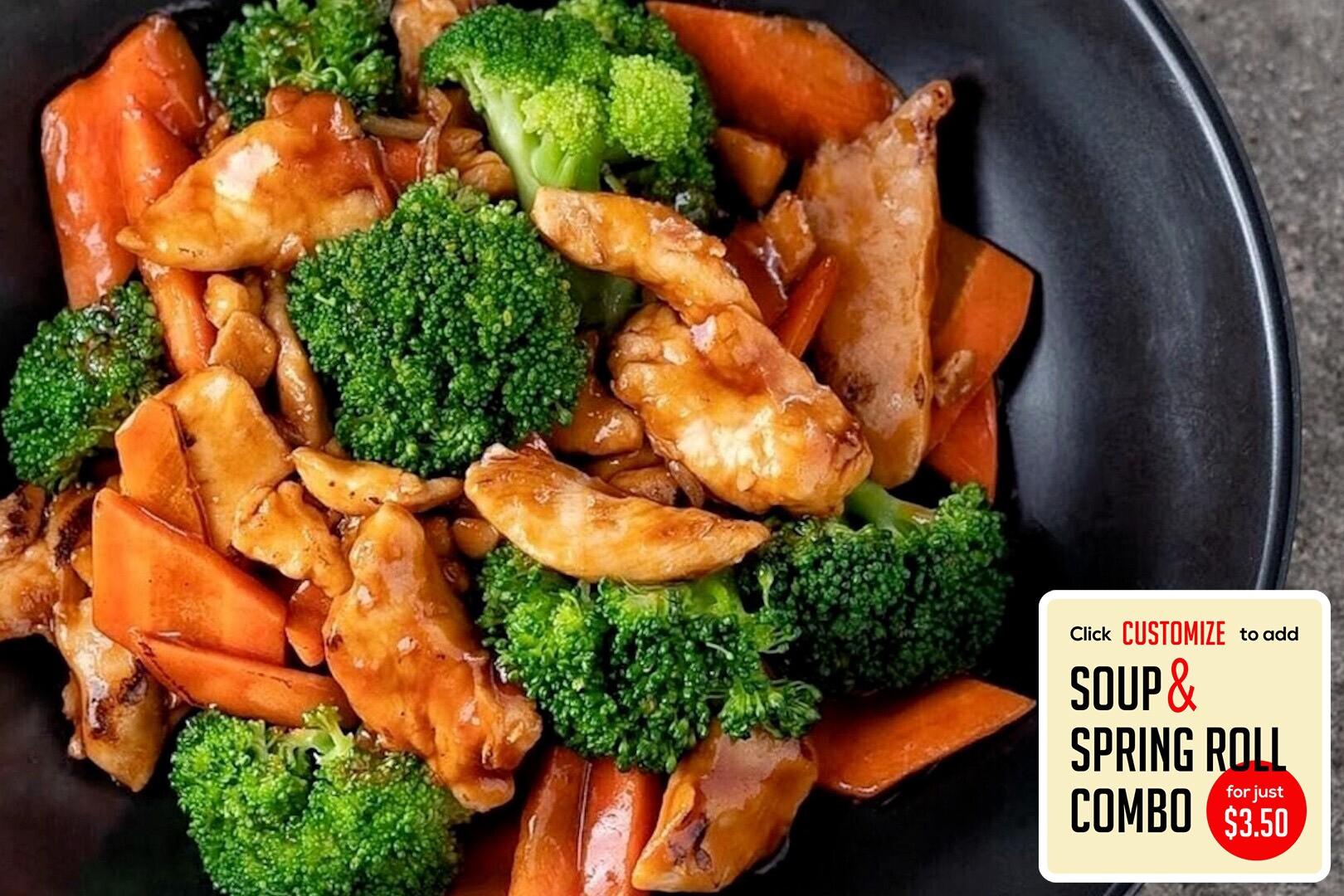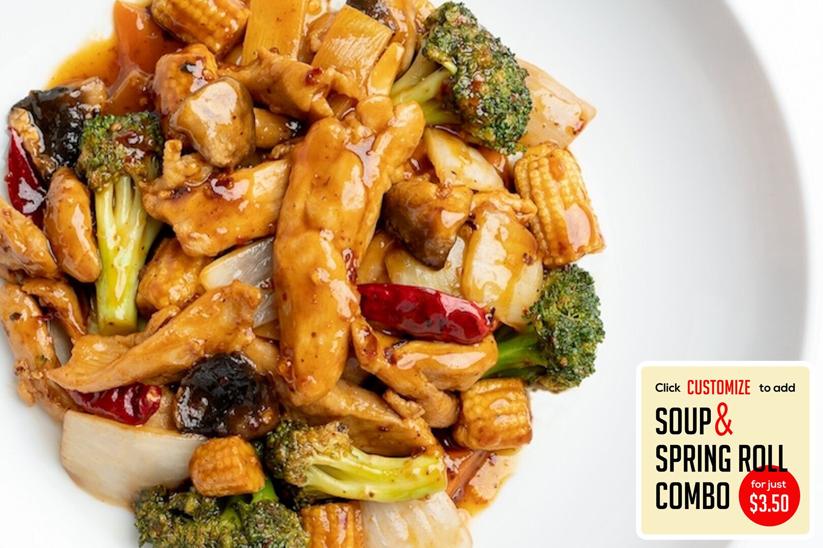 Chicken stir-fried in a spicy brown sauce w/ broccoli, carrots, baby corn, mushrooms, and onions.