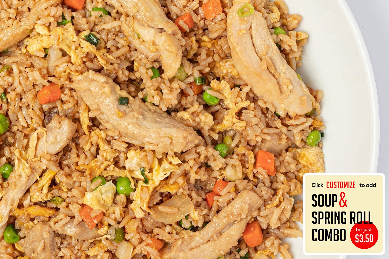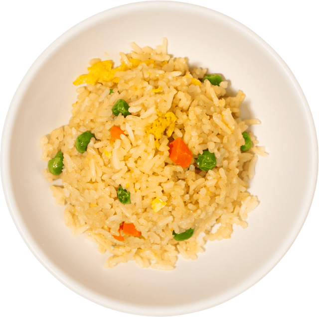 Chicken stir fried w/ rice, eggs, peas, carrots, onions, green onions