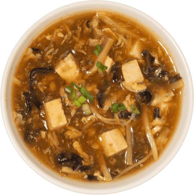 Vegetarian. Vital Farms eggs, mushrooms, bamboo shoots and scallions, in a spicy & sour vegetarian broth