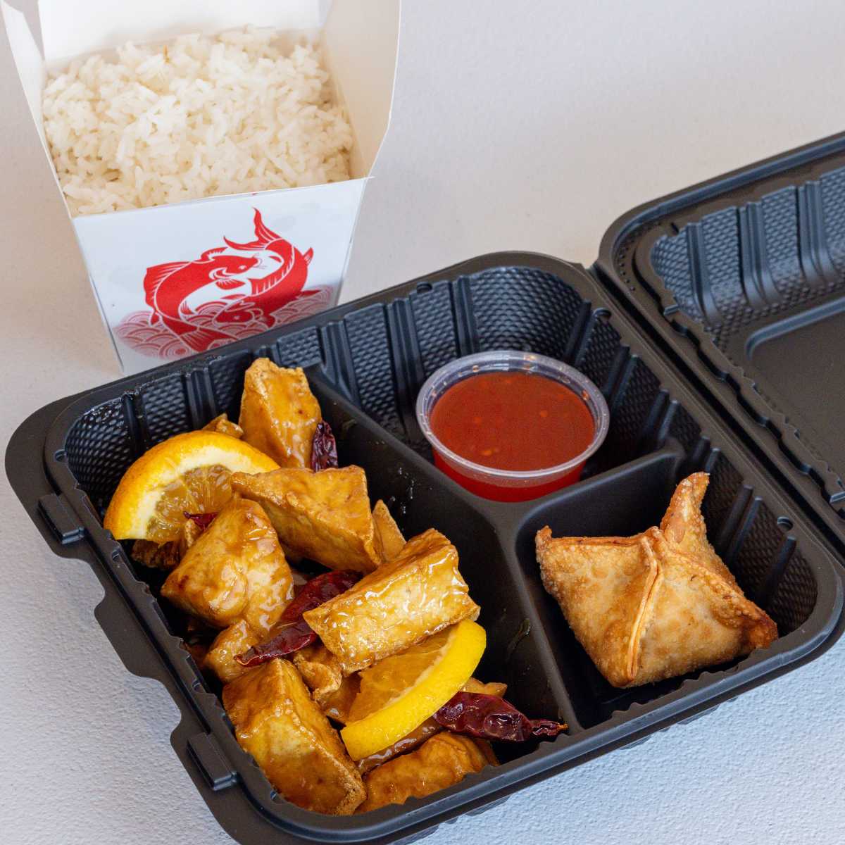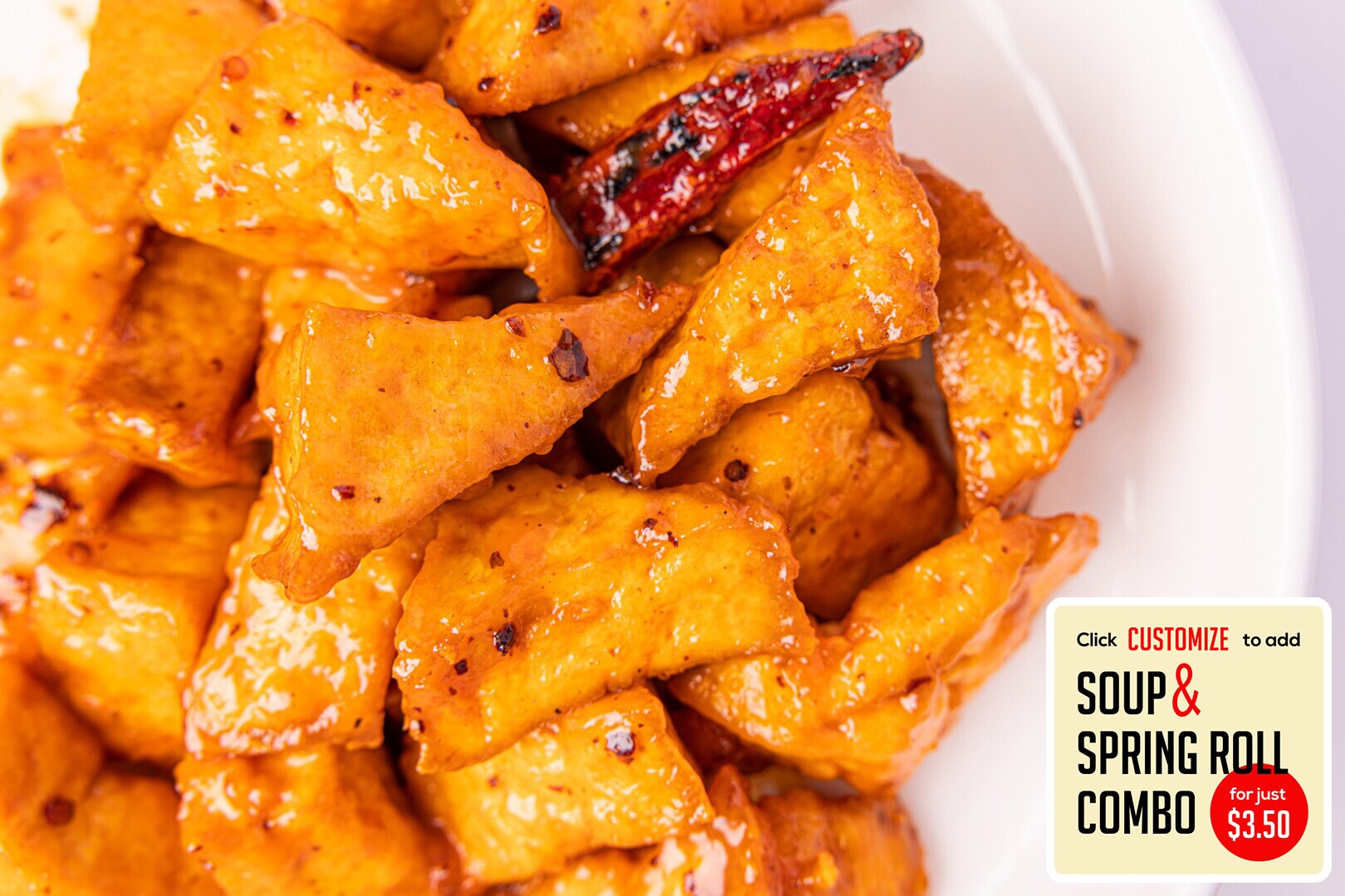 Flash-fried tofu in a sweet & spicy vegan & gluten-free orange sauce w/ chili peppers.