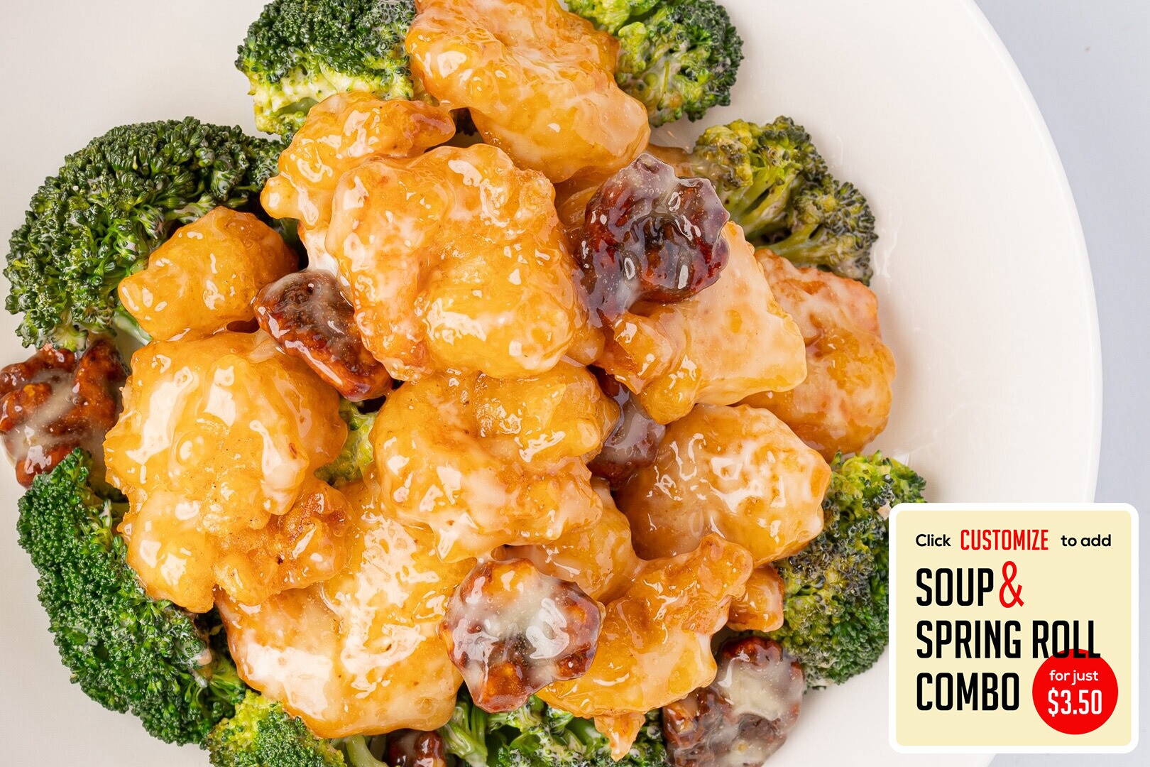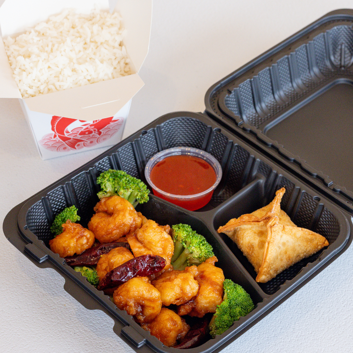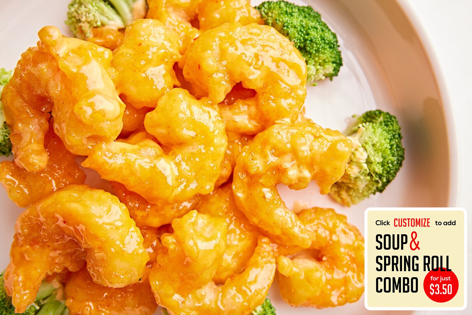Batter-fried in General Tso’s sweet & spicy sauce with delectable shrimp and crunchy broccoli & spicy peppers (optional).