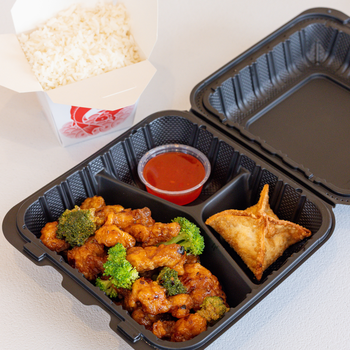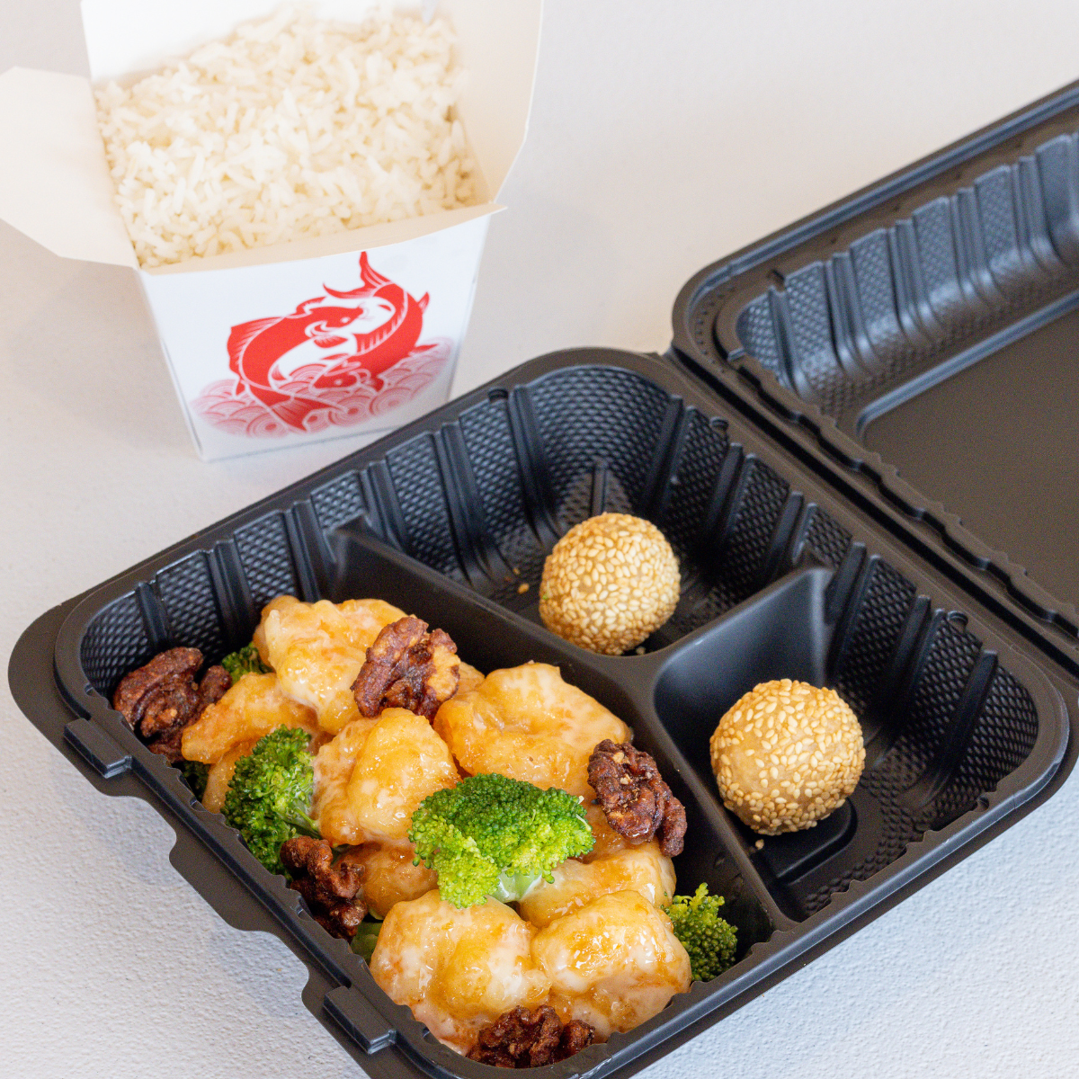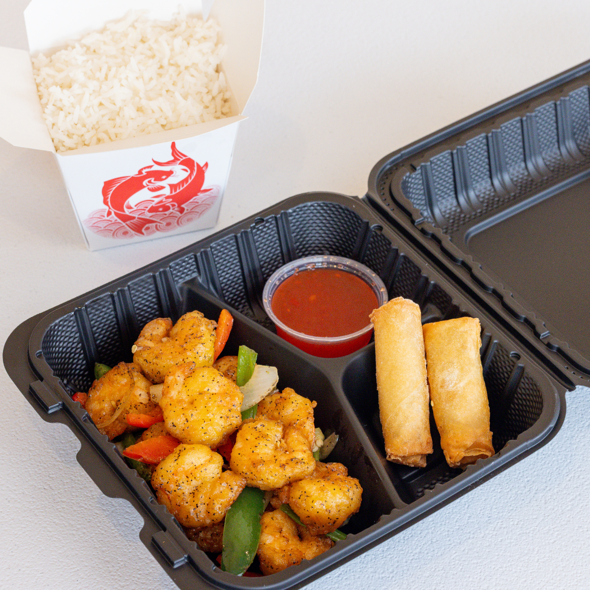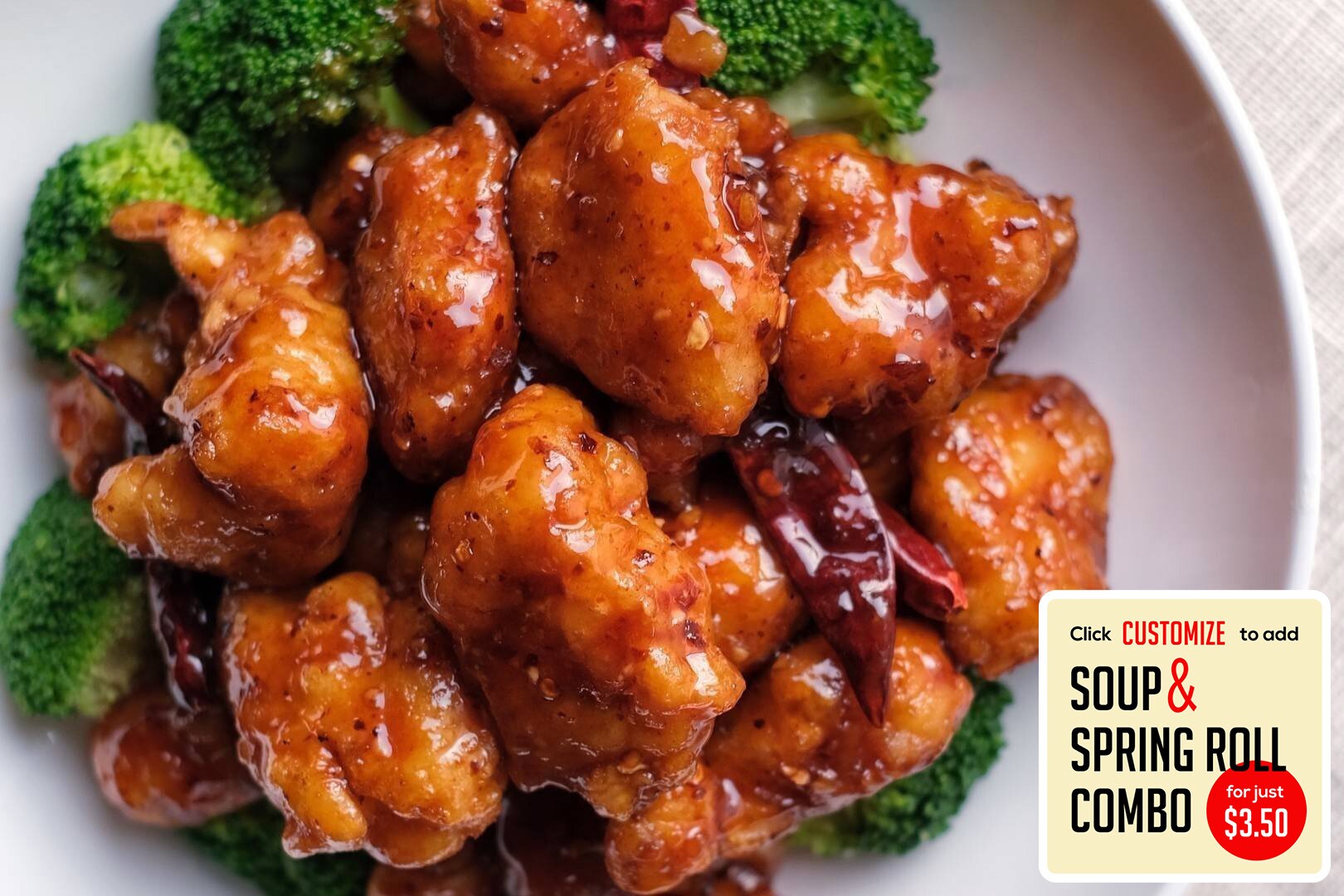 Batter-fried in General Tso’s sweet & spicy sauce with delectable shrimp and crunchy broccoli & spicy peppers (optional).