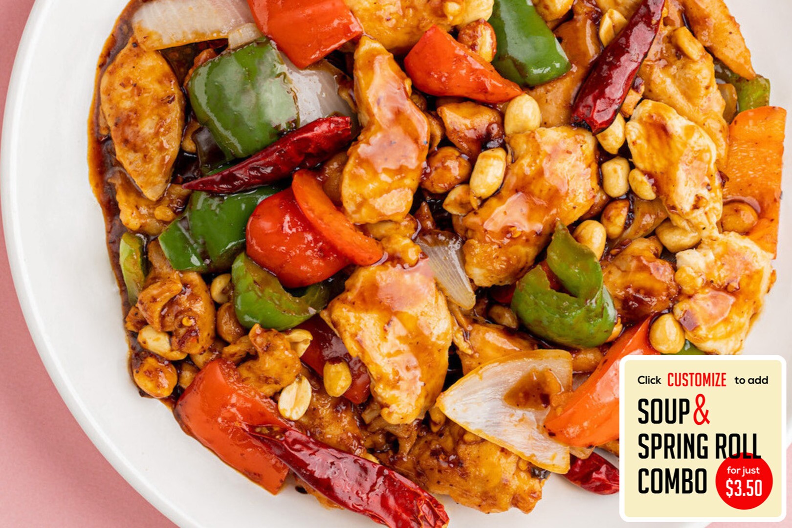 Chicken stir fried in a brown sauce w/ red & green bell peppers, onions, and peanuts.