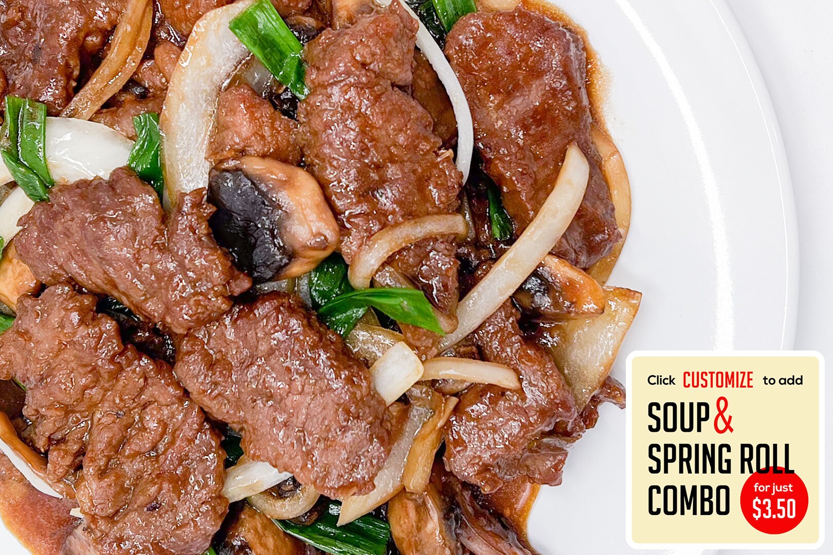 Tender beef in a ginger brown sauce, broccoli, mushrooms, green onions, and yellow onions.