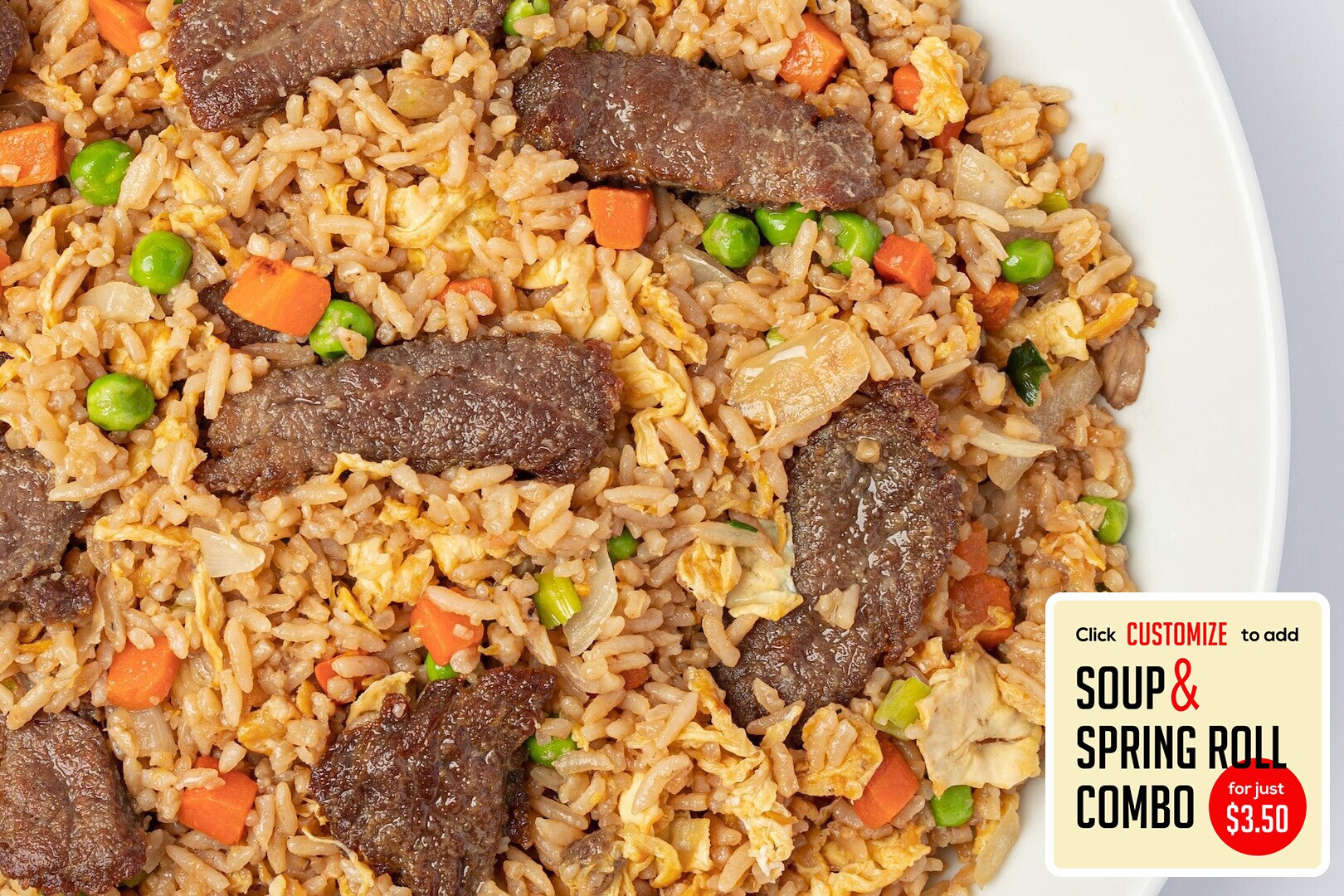 Flank steak stir fried w/ rice, eggs, peas, carrots, onions, green onions