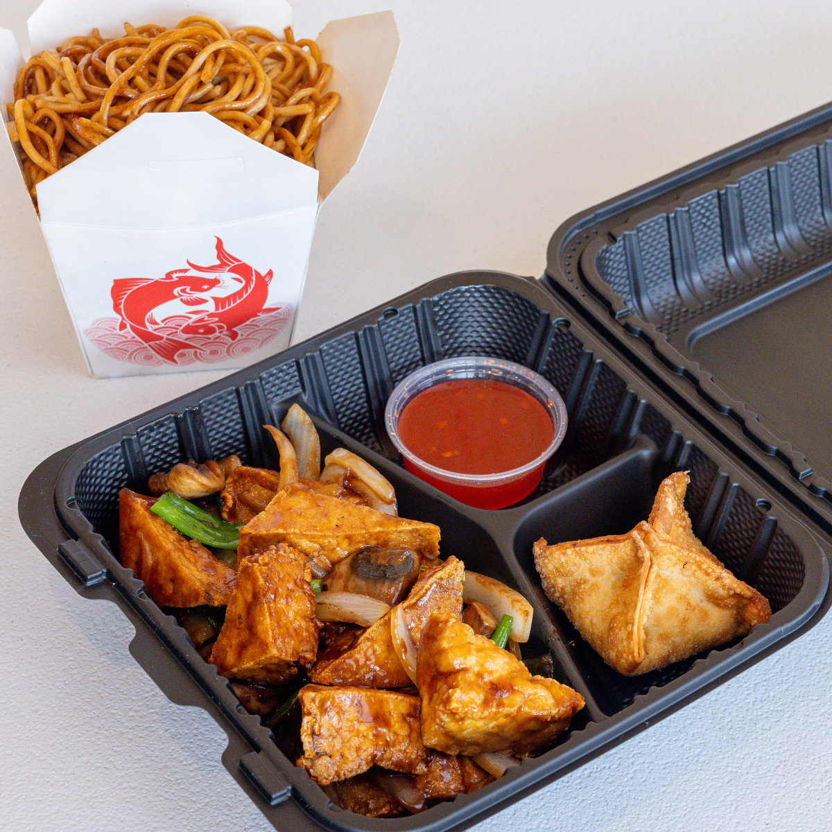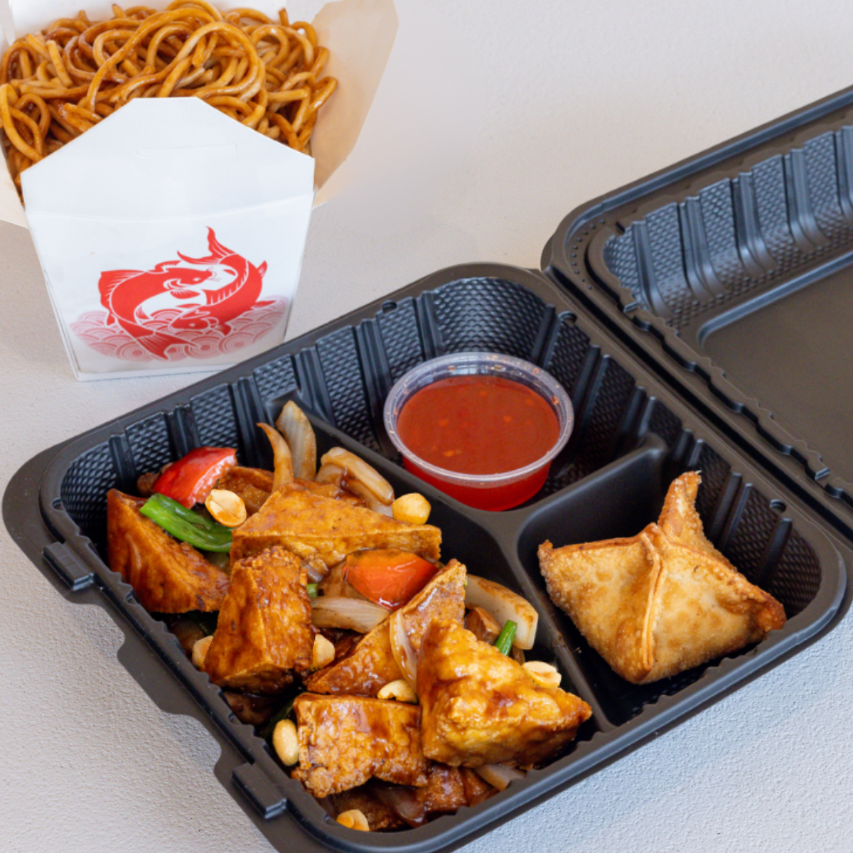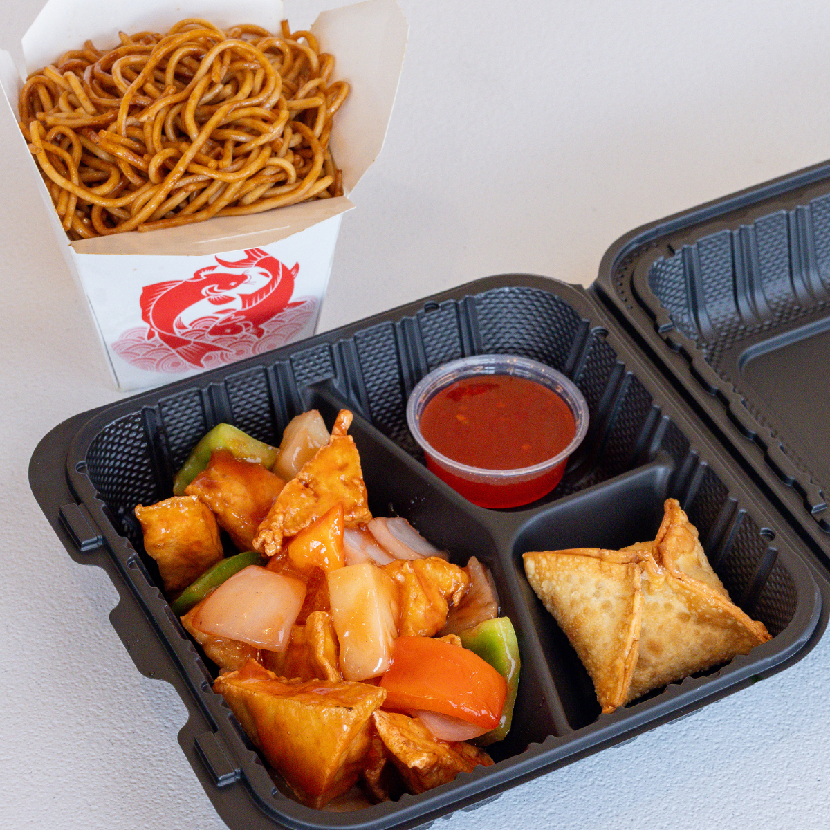 Flash fried tofu in a sweet & tangy vegan and gluten-free sauce w/ onions, bell peppers, & pineapple.