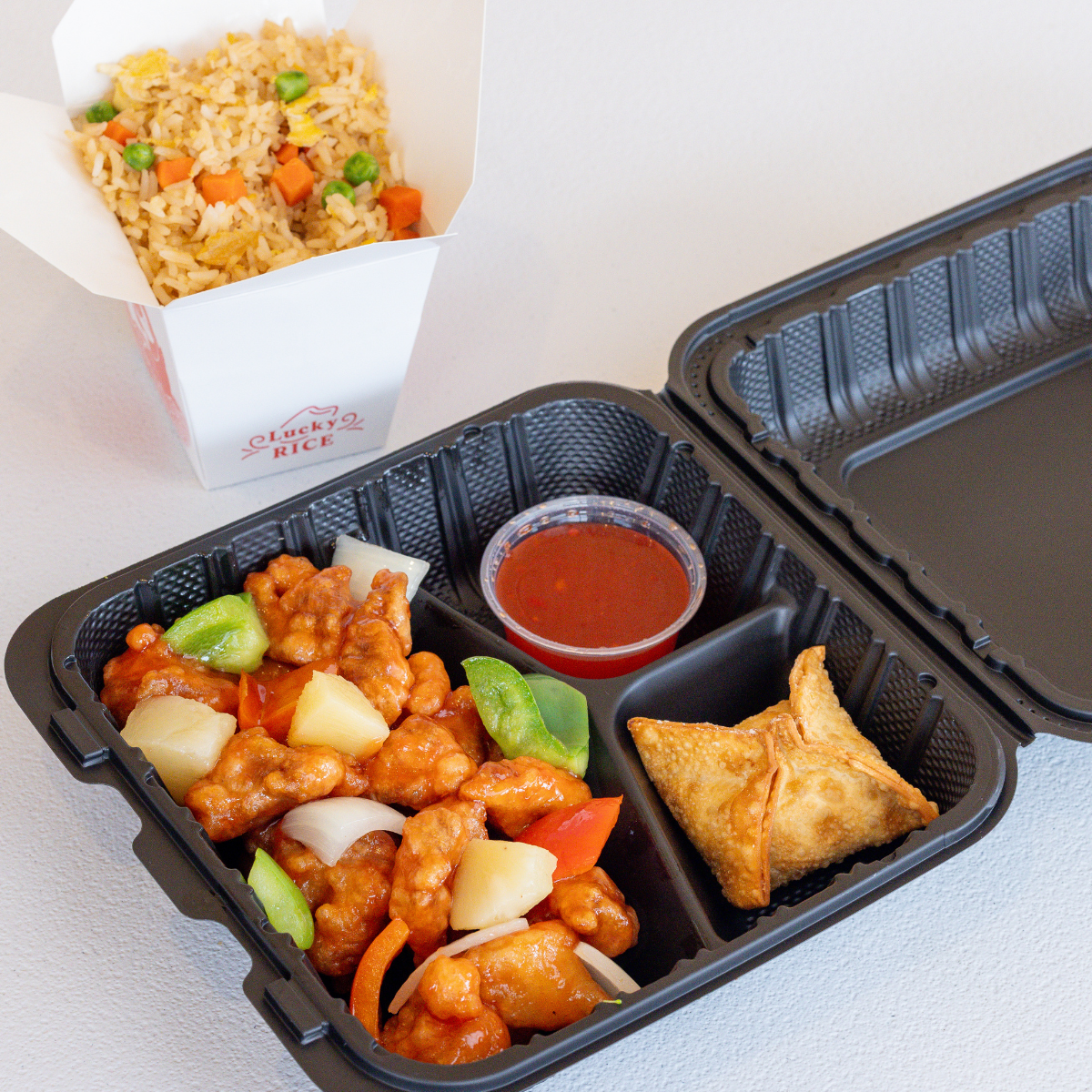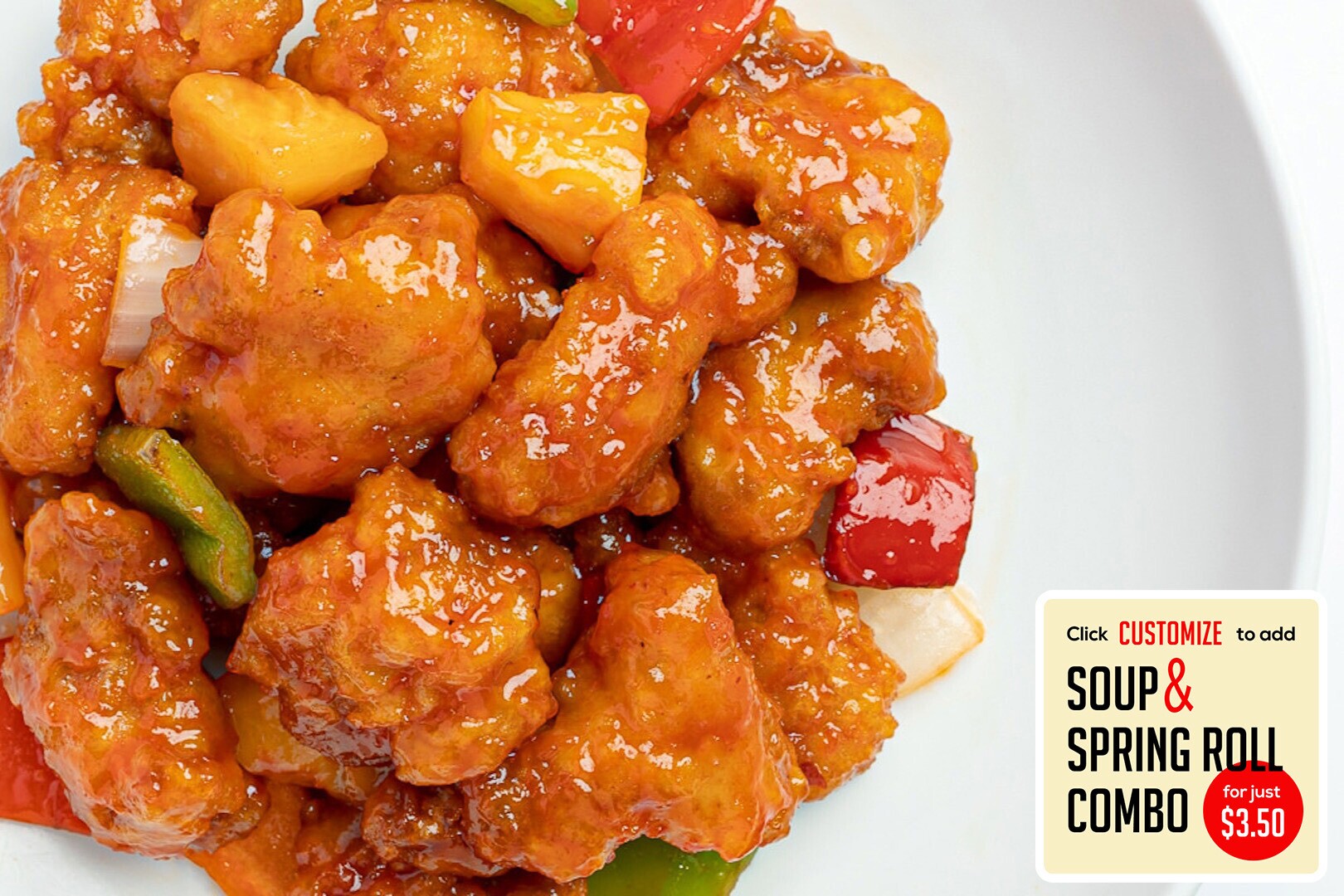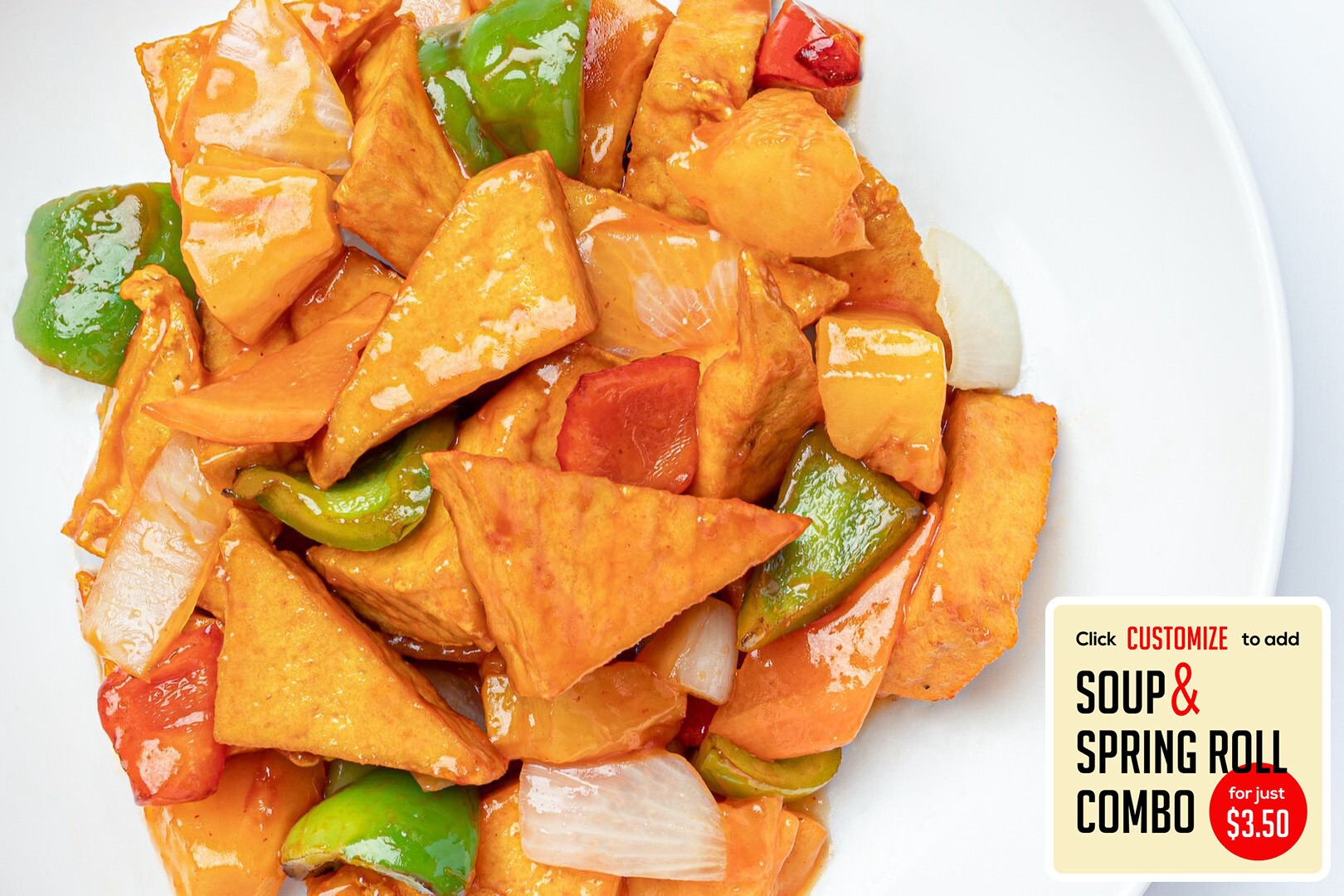 Flash fried tofu in a sweet & tangy vegan and gluten-free sauce w/ onions, bell peppers, & pineapple
