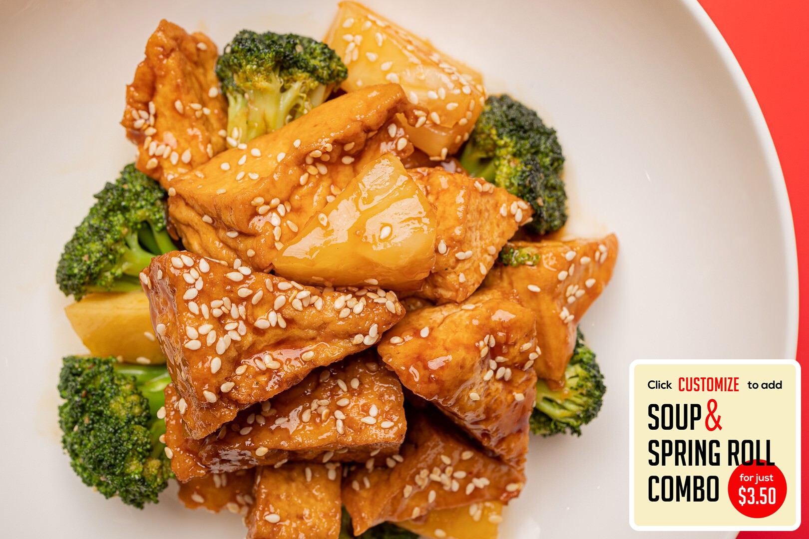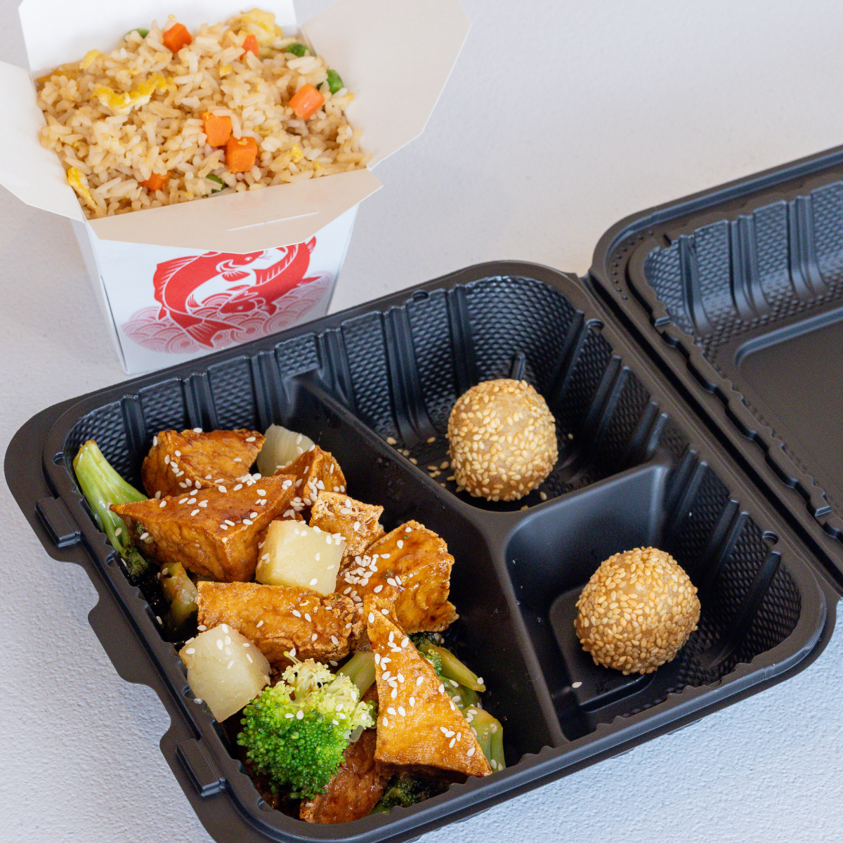 Flash-fried tofu in a sweet vegan & gluten-free sesame sauce w/ broccoli & pineapple, topped with sesame seeds