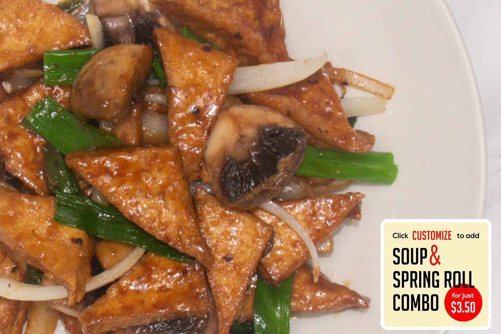 Juicy tofu wok tossed with savory vegan brown sauce with mushrooms, green onions, and yellow onion
