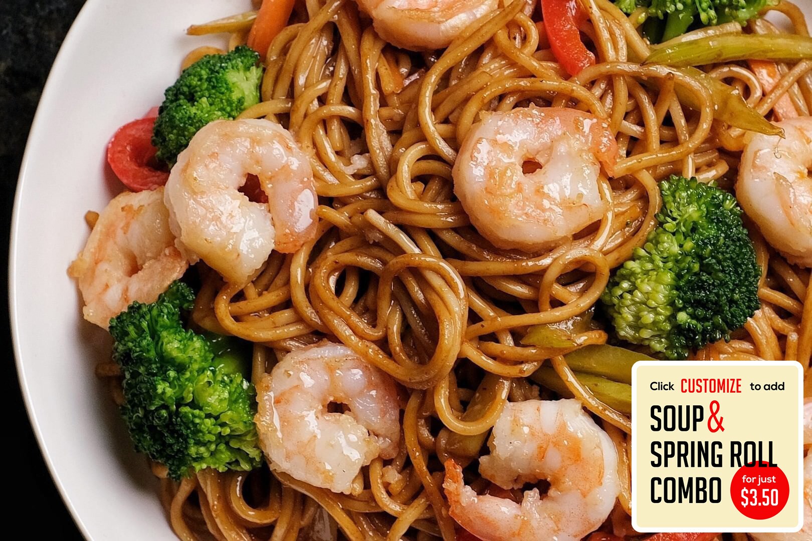Shrimp & egg noodles stir-fried in a brown sauce with bell peppers, onions, celery, broccoli & carrots