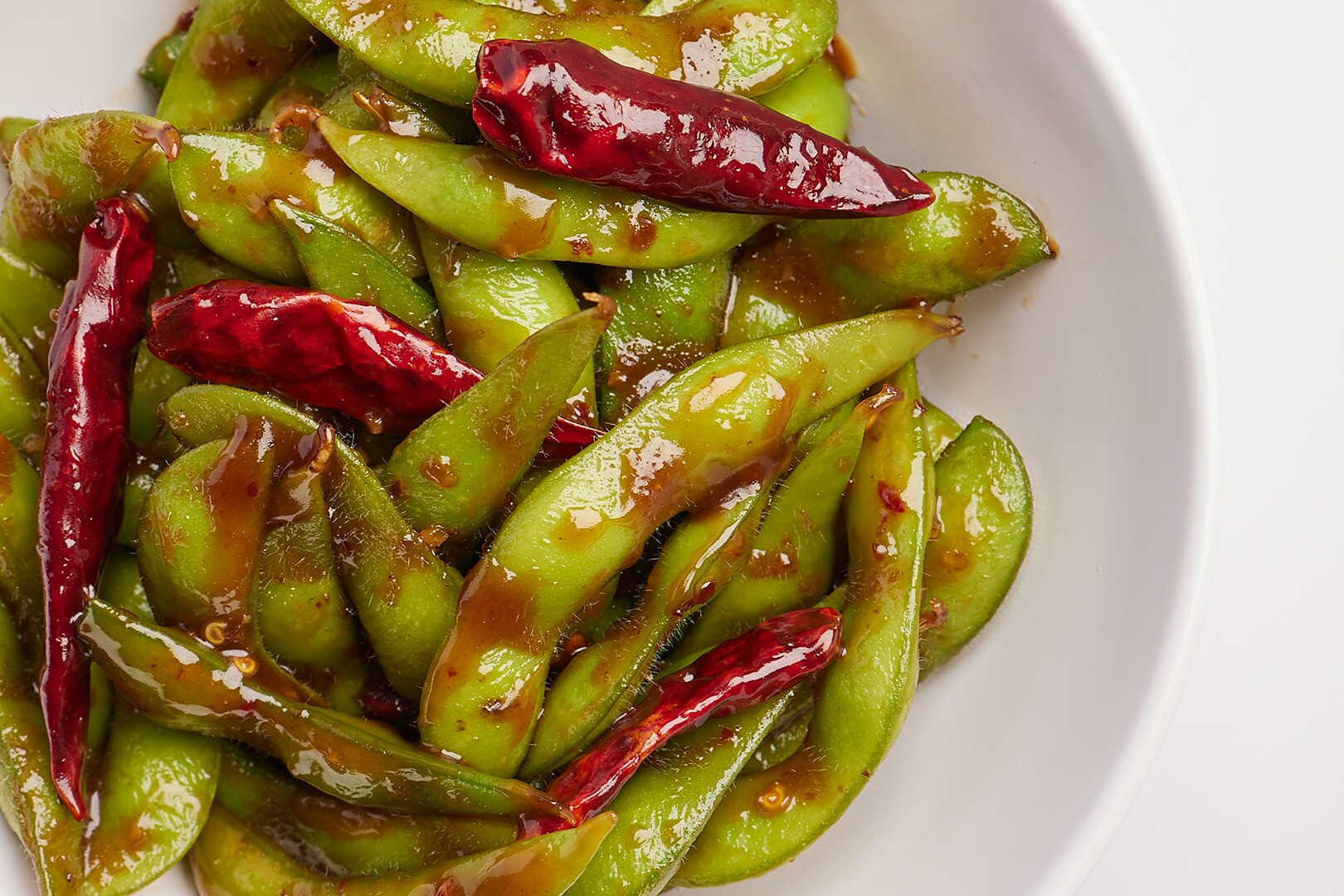 Soybeans in a pod, stir-fried in a sweet & spicy garlic sauce.