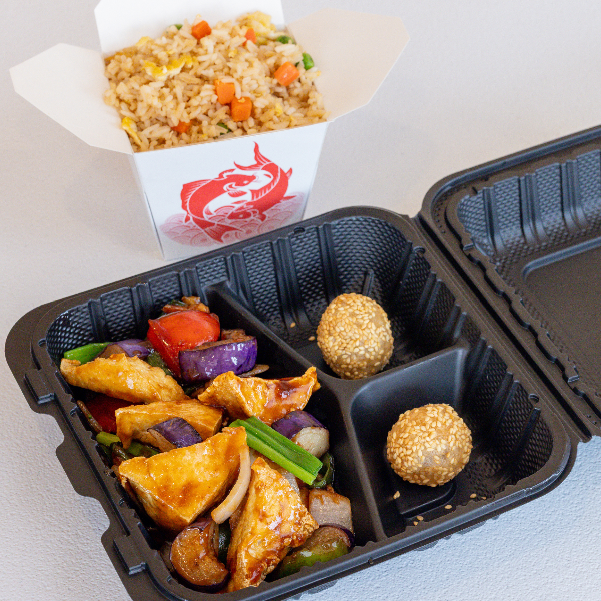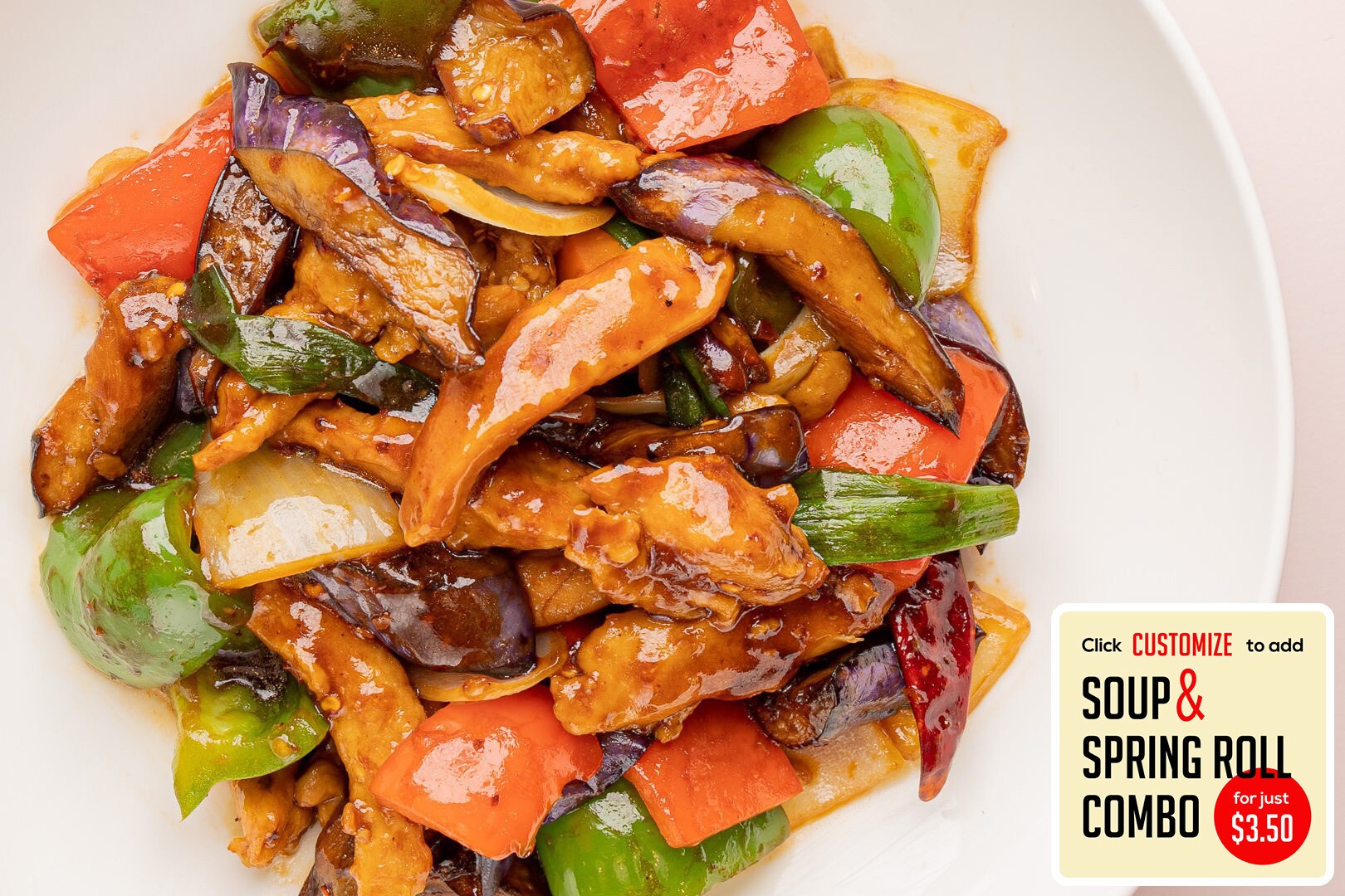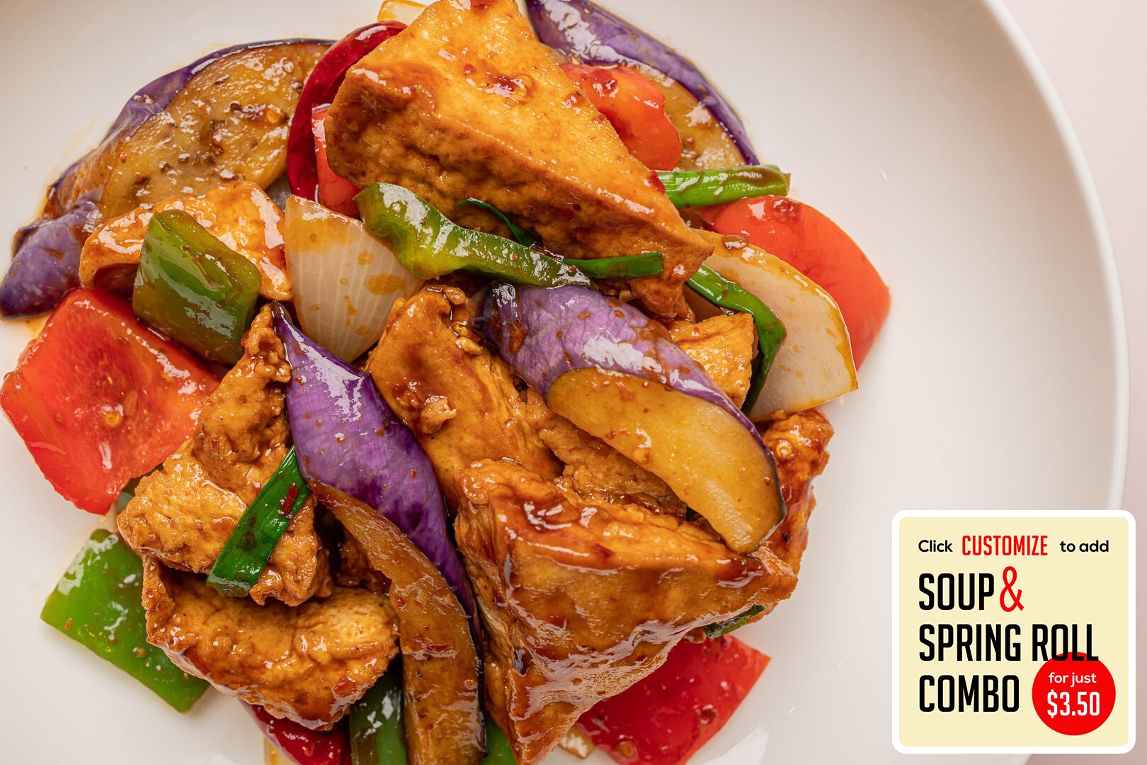 Flash fried tofu, Japanese eggplant, green onion, onion, green & red bell pepper stir fried in a vegan, gluten-free brown sauce.