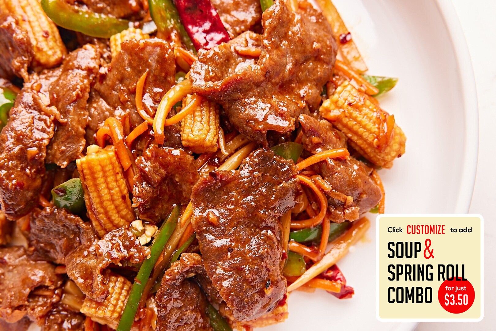 Flank steak in a spicy Szechuan sauce w/ baby corn, carrots, jalapeños, bamboo shoots, & chili peppers.