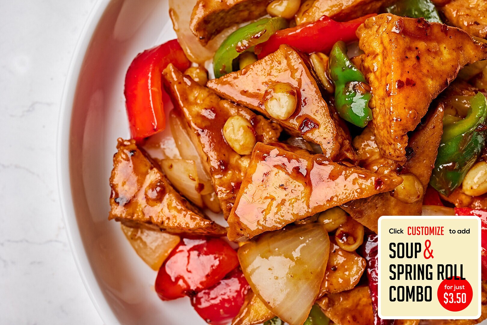 flash-fried tofu stir fried in a vegan & gluten-free brown sauce w/ red & green bell peppers, onions, and peanuts