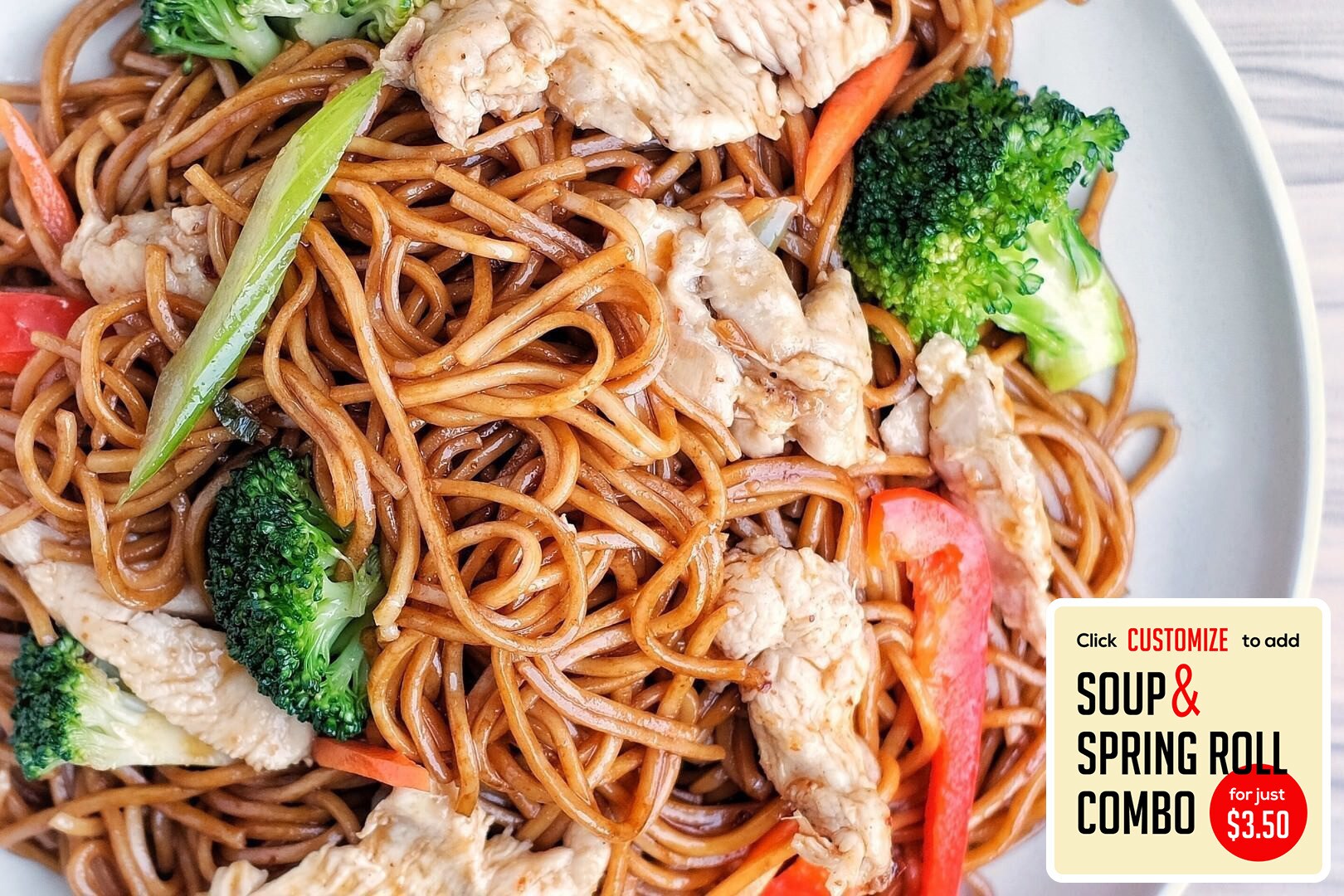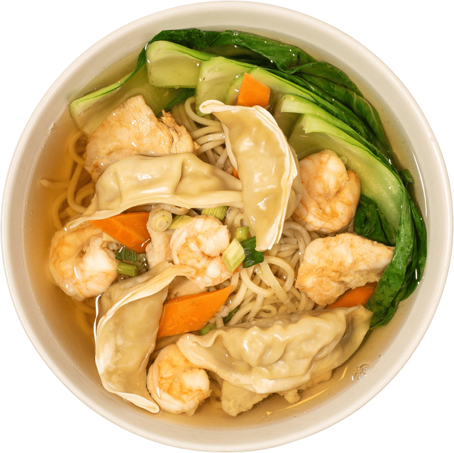 Large entree sized bowl of egg noodles, shrimp, chicken, bok choy, carrots, bamboo shoots, and pork wontons in a flavorful broth. Served with homemade chili oil on the side. No combo.