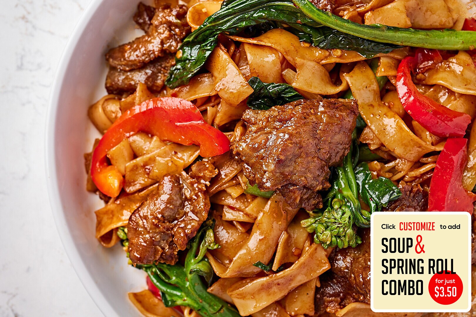 Tender steak, flat rice noodles, Chinese broccoli, Thai basil, onion, bell peppers, in a smoky, spicy garlic sauce.