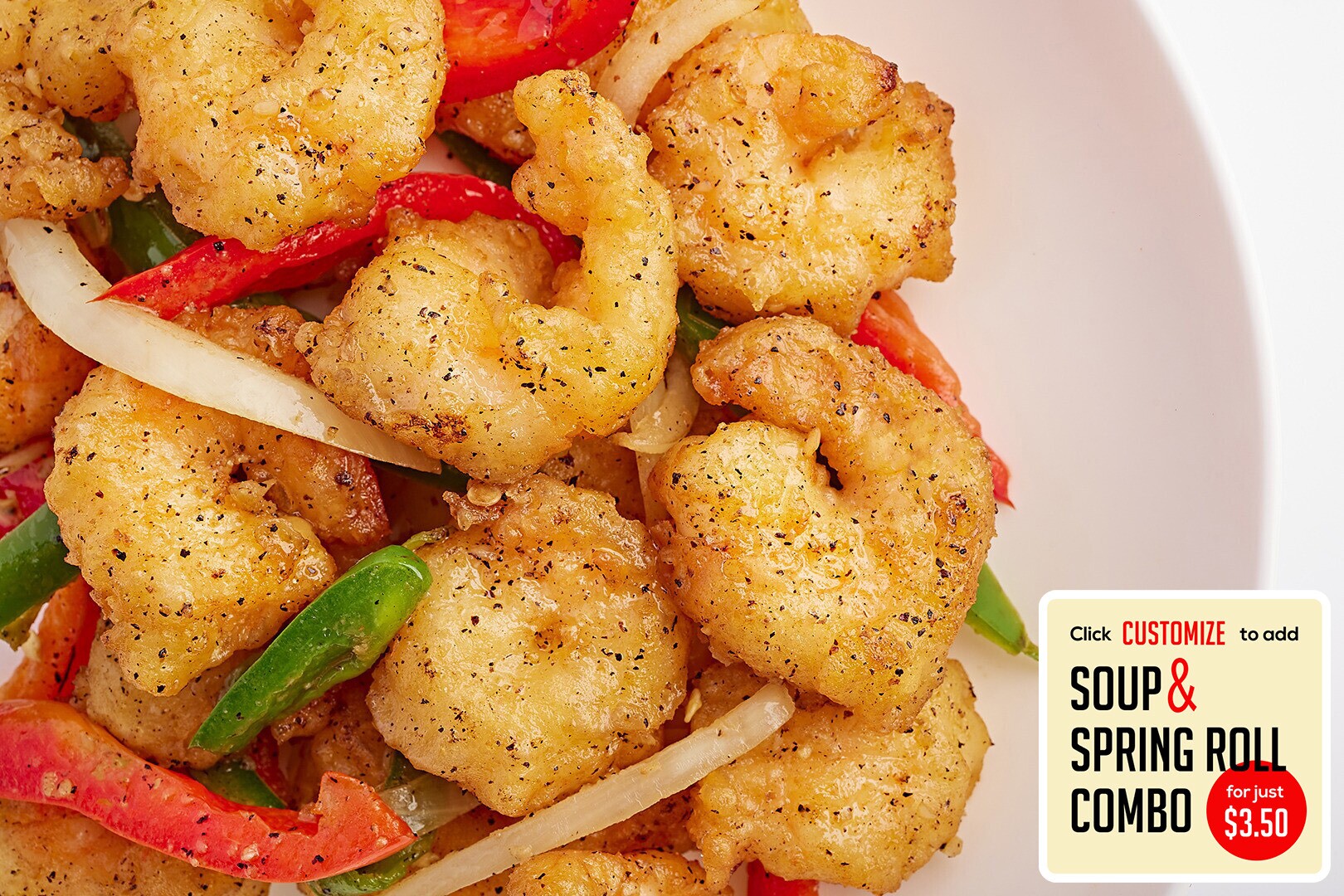 Peppery shrimp wok tossed with jalapenos, bell peppers, and onion goodness
