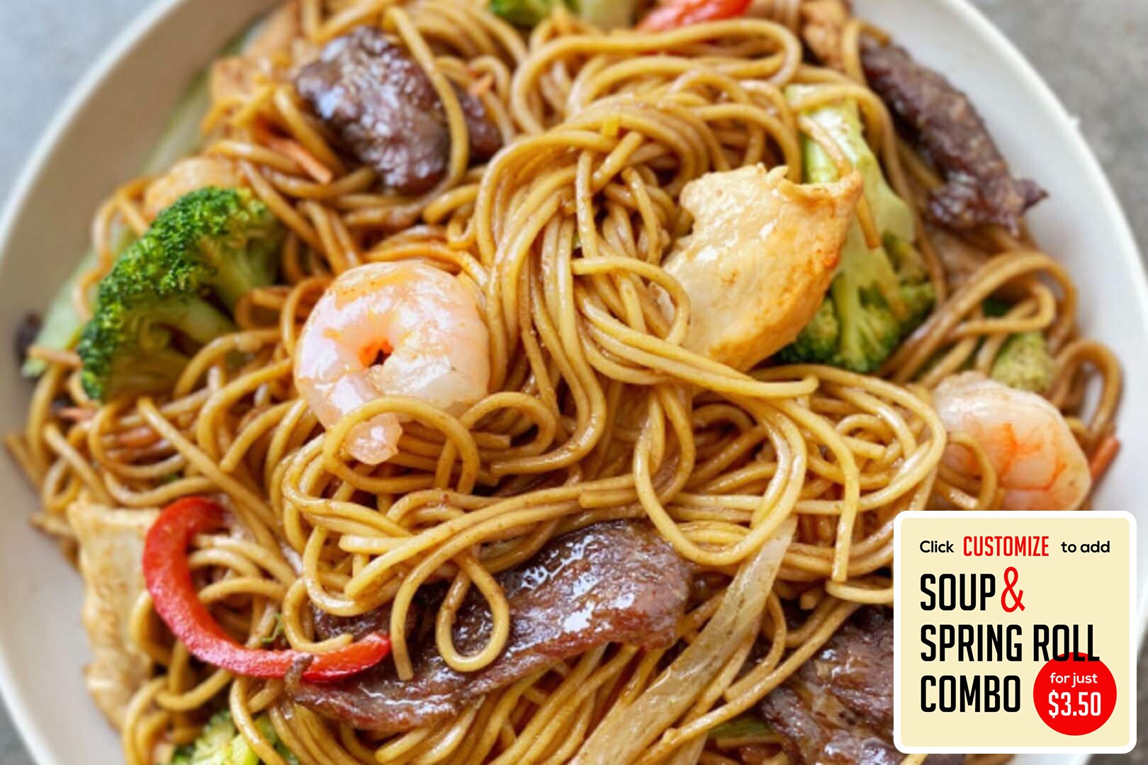 Tender beef, chicken, and shrimp stir-fried with egg noodles & veggies