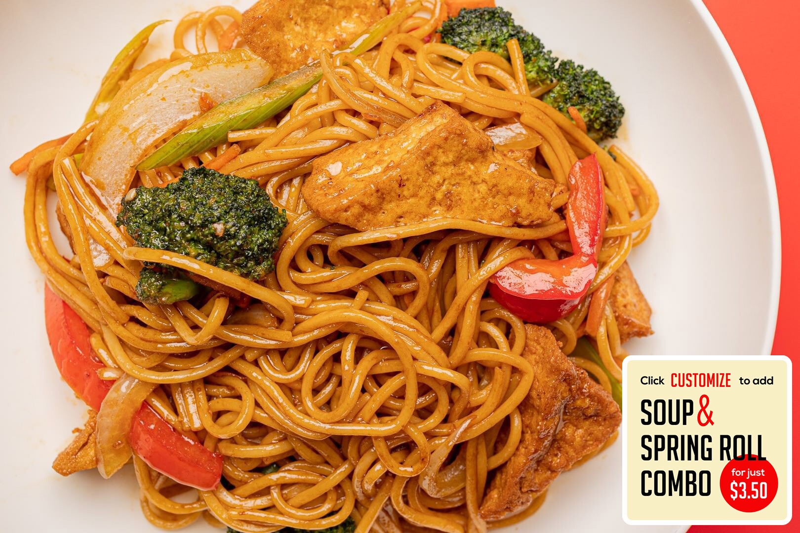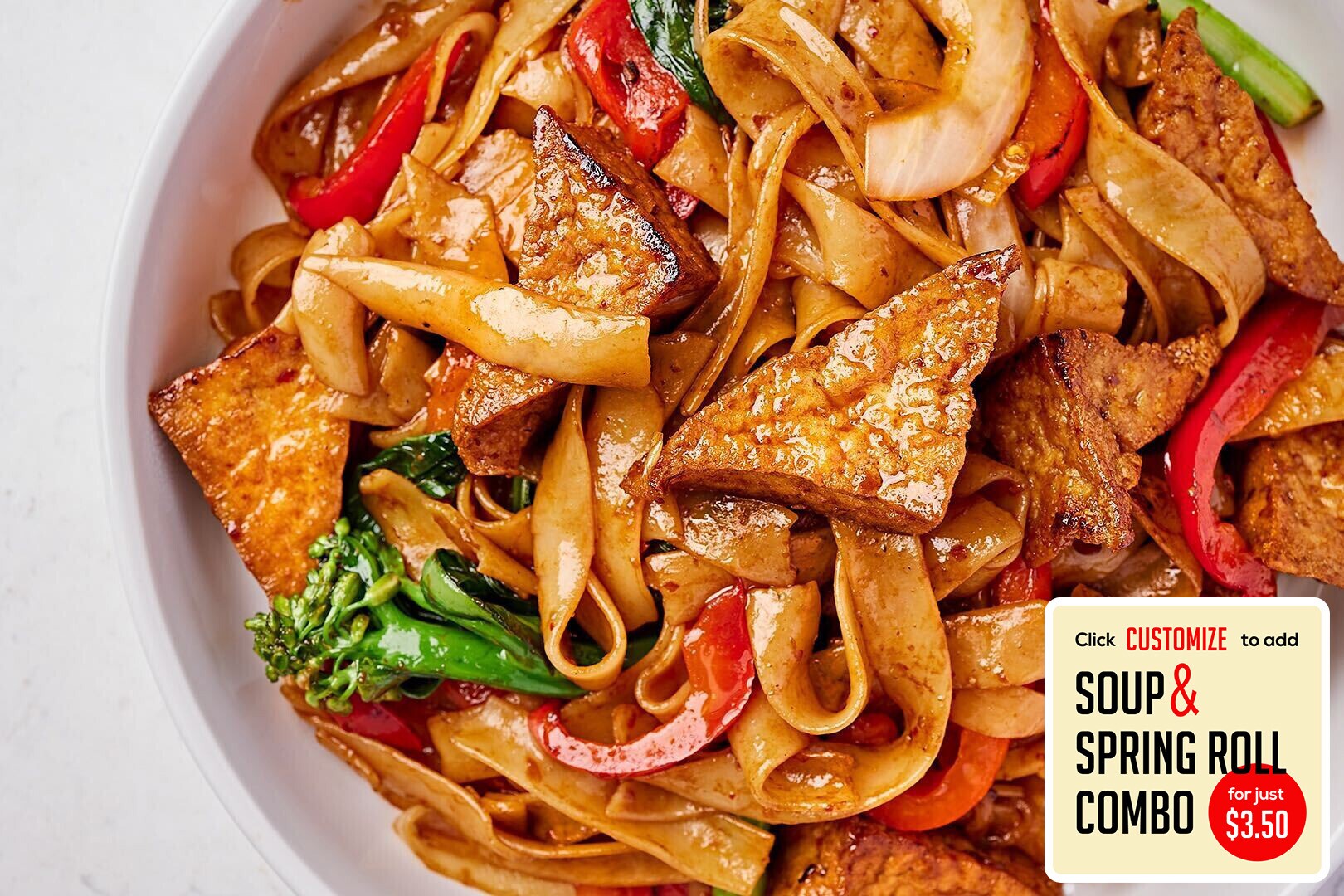 Tofu & egg noodles stirfried in a brown sauce with bell peppers, onions, broccoli & carrots