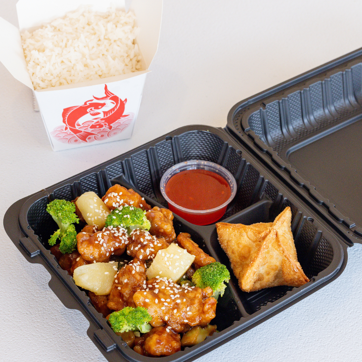 Batter-fried chicken in a sweet sesame sauce w/ broccoli & pineapple, topped with sesame seeds.