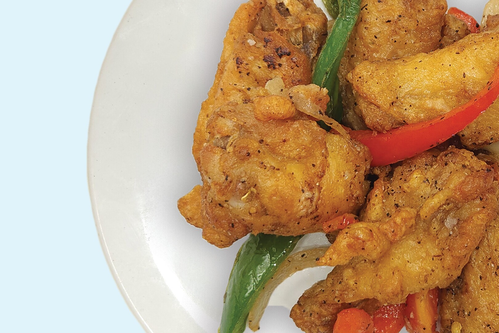 This dry rub comes with a kick! Crispy fried wings, wok tossed with salt, pepper, jalapeños, onions and bell peppers.