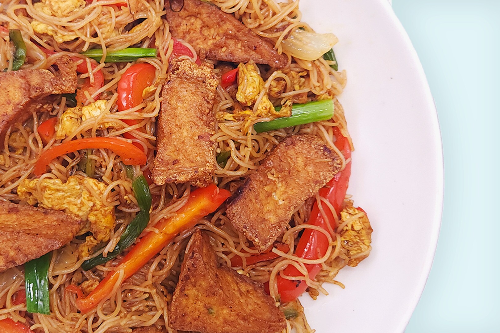 A vegetarian spin on a an instant classic. Tofu, tossed with a vibrant mix of fresh peppers, eggs, and onions, all brought together in a rich curry sauce. It's a delightful balance of savory and sweet that captures the essence of Singaporean street food.