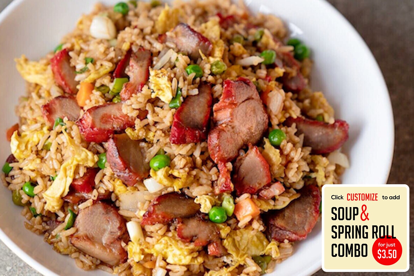 Char Siu BBQ pork, eggs, onions, peas & carrots