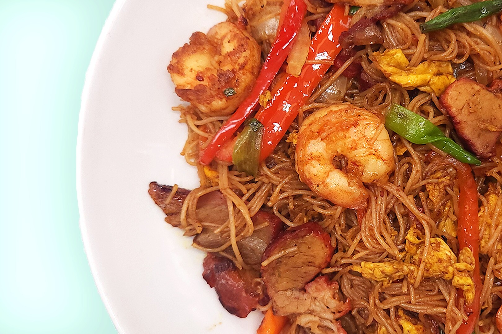 This dish features succulent shrimp, tender char siu pork, and a vibrant mix of fresh peppers and onions, all brought together in a rich curry sauce. It's a delightful balance of savory and sweet that captures the essence of Singaporean street food.
