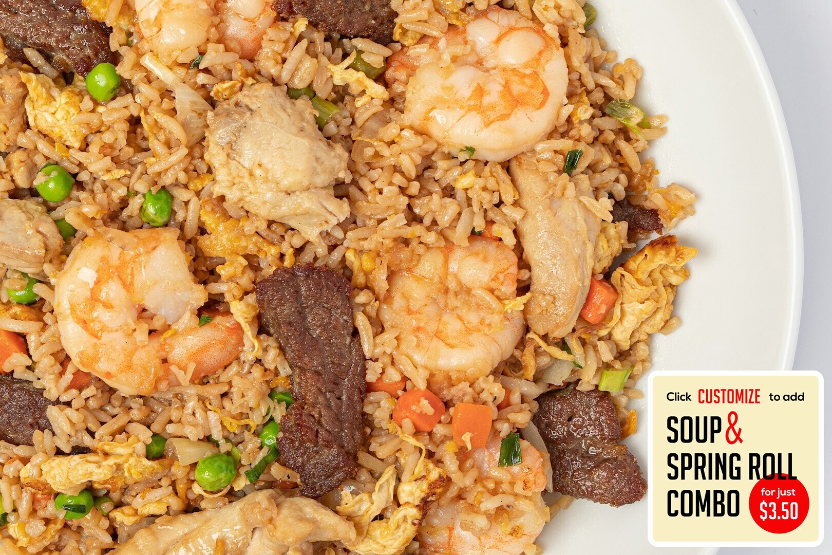 shrimp, beef, & chicken stir fried w/ rice, eggs, peas, carrots, onions, green onions
